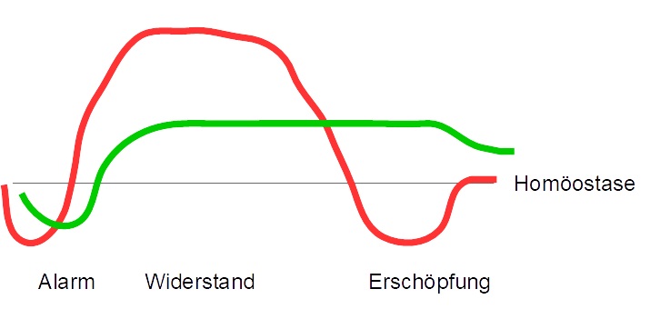 Die drei Phase der Stressreaktion, nach Panossian, A., & Wikman, G. (2010), verändert. Unter der Einwirkung von Adaptogenen (grüne Kurve) fällt die Stressreaktion schwächer aus, die Belastung in der Widerstandsphase ist weniger stark, die Erschöpfungsphase entfällt im Idealfall oder tritt später ein als ohne (rote Kurve).